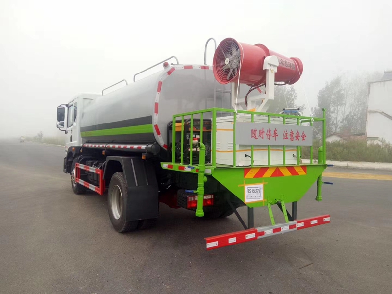4500軸距,玉柴200馬力/康機210馬力發(fā)動機,法士特8檔變速箱,10.00鋼絲胎,前橋4.5T后橋10T 原廠空調,容積15立方米,ABS ,采用大流量水泵,大通徑球閥、基本灑水功能前沖、后灑、側噴、工作平臺帶軸承高炮(可調節(jié)成霧狀、直柱狀)、可泵進泵出、罐體兩側圓形炮筒、帶兩根抽水軟管,尾部加裝30米霧炮機組。