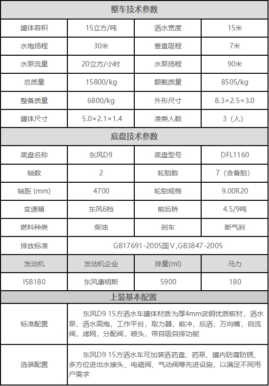 東風D9 15方灑水車配置: