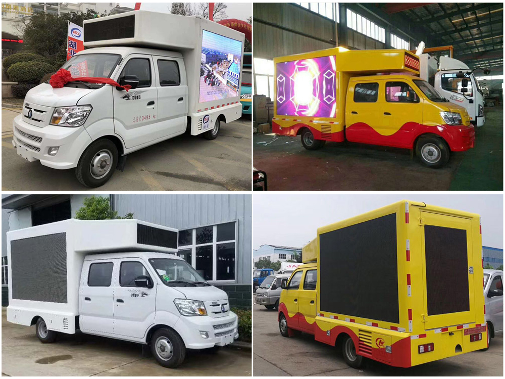 廣告車選裝配置:客戶可根據(jù)需求選裝屏幕清晰度(P10彩屏、P8彩屏、P6彩屏、P5彩屏、P4彩屏)、單面彩屏、雙面彩屏、雙面